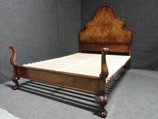 This is a good Queen Anne burr walnut double bed, with shaped headboard, and good baseboard. new bed base which comes into two sections.