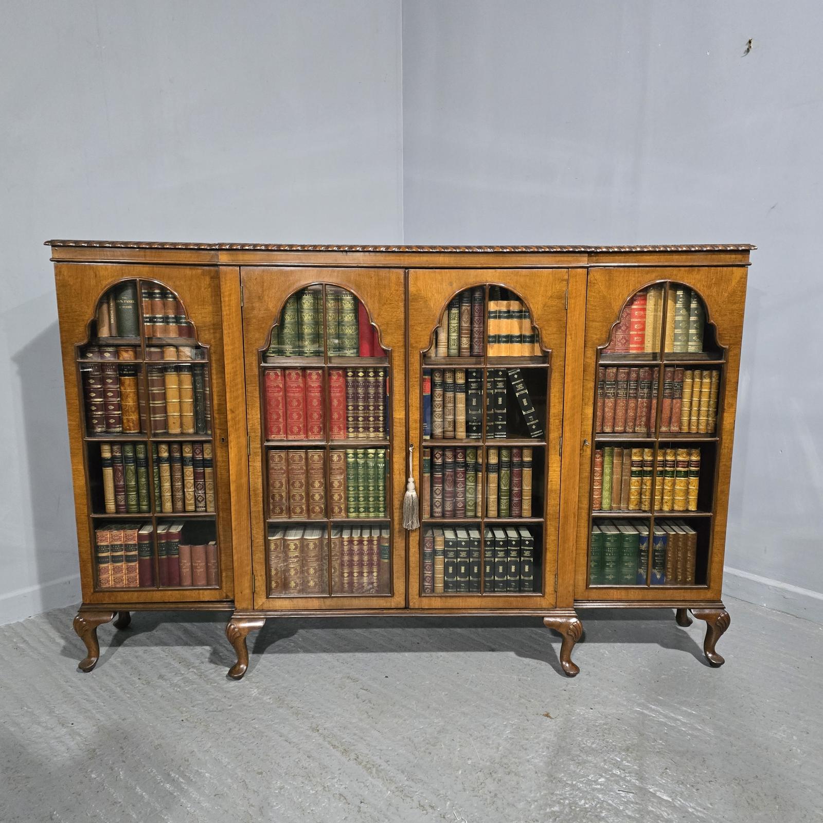 A very nice quality Queen Anne style four door walnut breakfront library bookcase, nine adjustable solid walnut shelves, standing on squat cabriole legs, all working locks with keys, waxed and cleaned ready to be placed in your home.