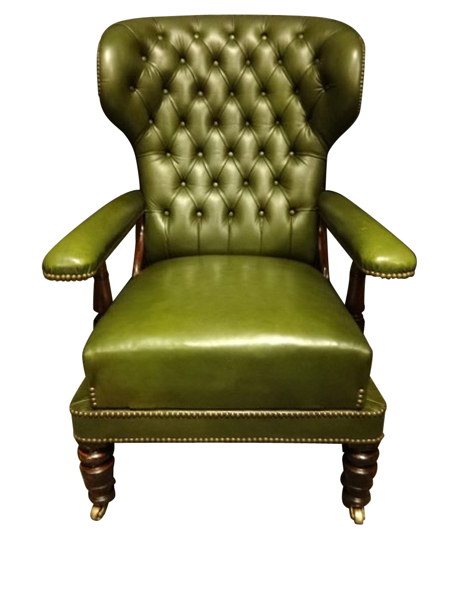 Rare leather reclining armchair, in green leather with mahogany frame and brass castors, patent no stamped onto leg, brass studded, in excellent condition.