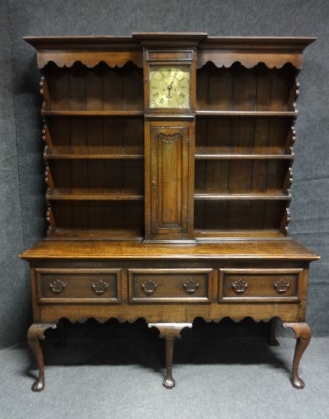 This is a very rare oak dresser, cabriole legs, 3 drawers with brass handles, solid backboards and fitted with a brass faced 8 day grandfather clock, excellent colour and condition.