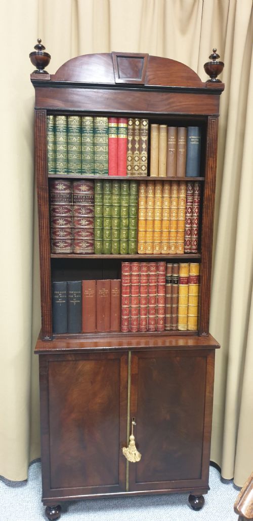 Regency mahogany bookcase on cupboard of small proportions with open adjustable shelving, double doors with brass slamming strip, standing o turned brass feet, excellent colour and condition.