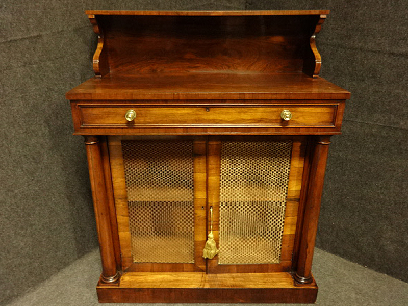 This is a good Regency antique rosewood chiffonier. It has double doors with replacement grills, with columns either side, single drawer, top with shelf, a very good colour and in very good condition.