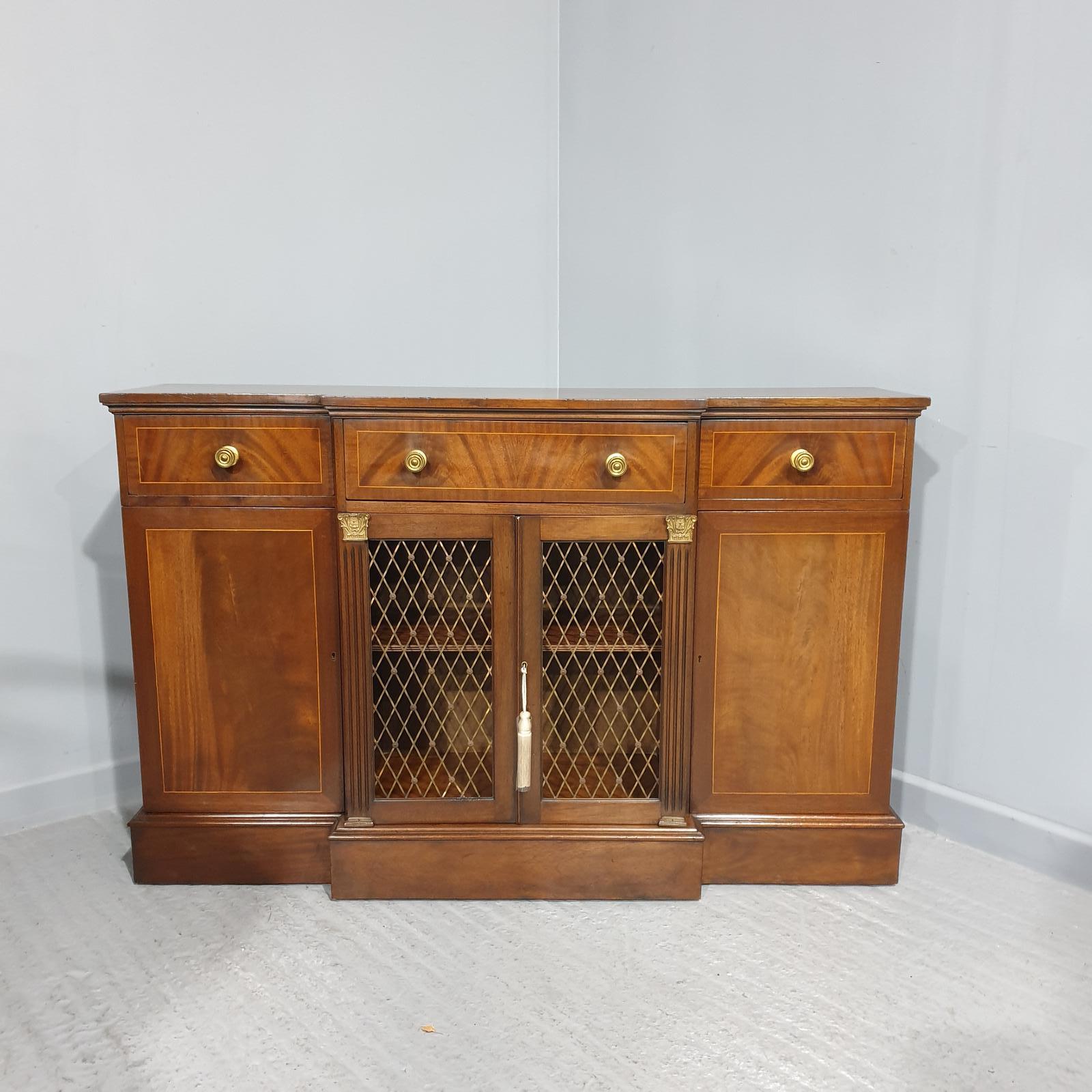 A good Regency style mahogany breakfront sideboard or side cabinet with brass grills, handles and mounts, inlaid with boxwood and in overall excellent condition.