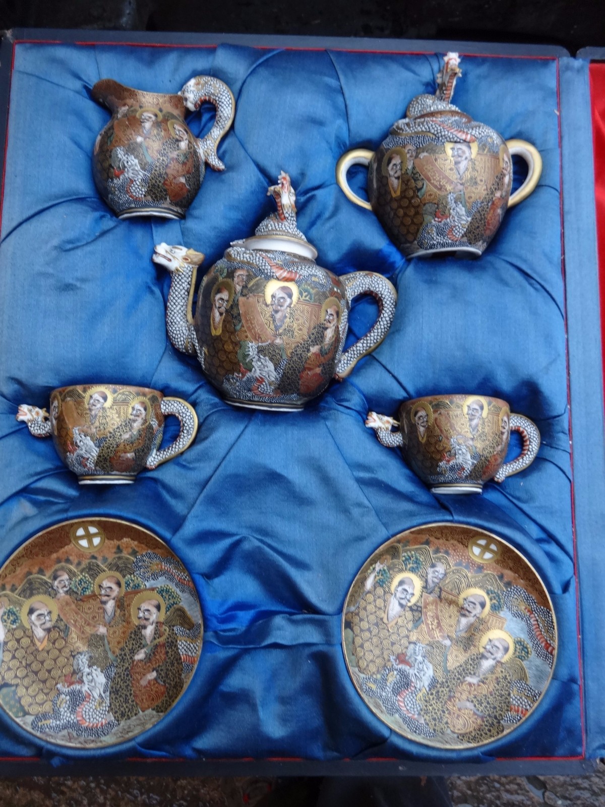 Very good quality Satsuma boxed tea set for two, very good condition, full marks.