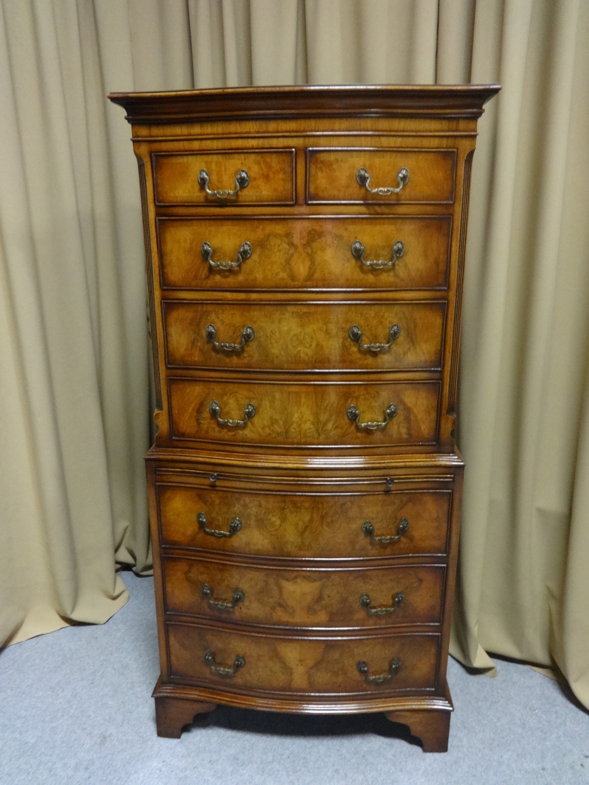 Serpentine Burr Walnut Chest on Chest of Drawers