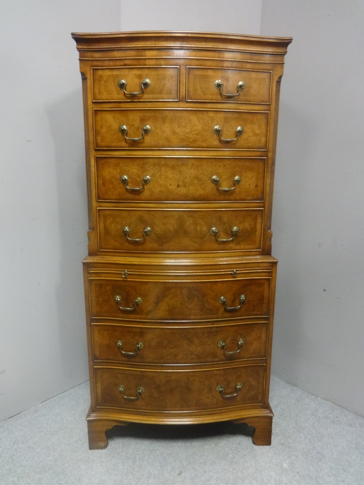Excellent quality serpentine burr walnut chest on chest of drawers with brushing slide, brass handles, excellent colour and condition.