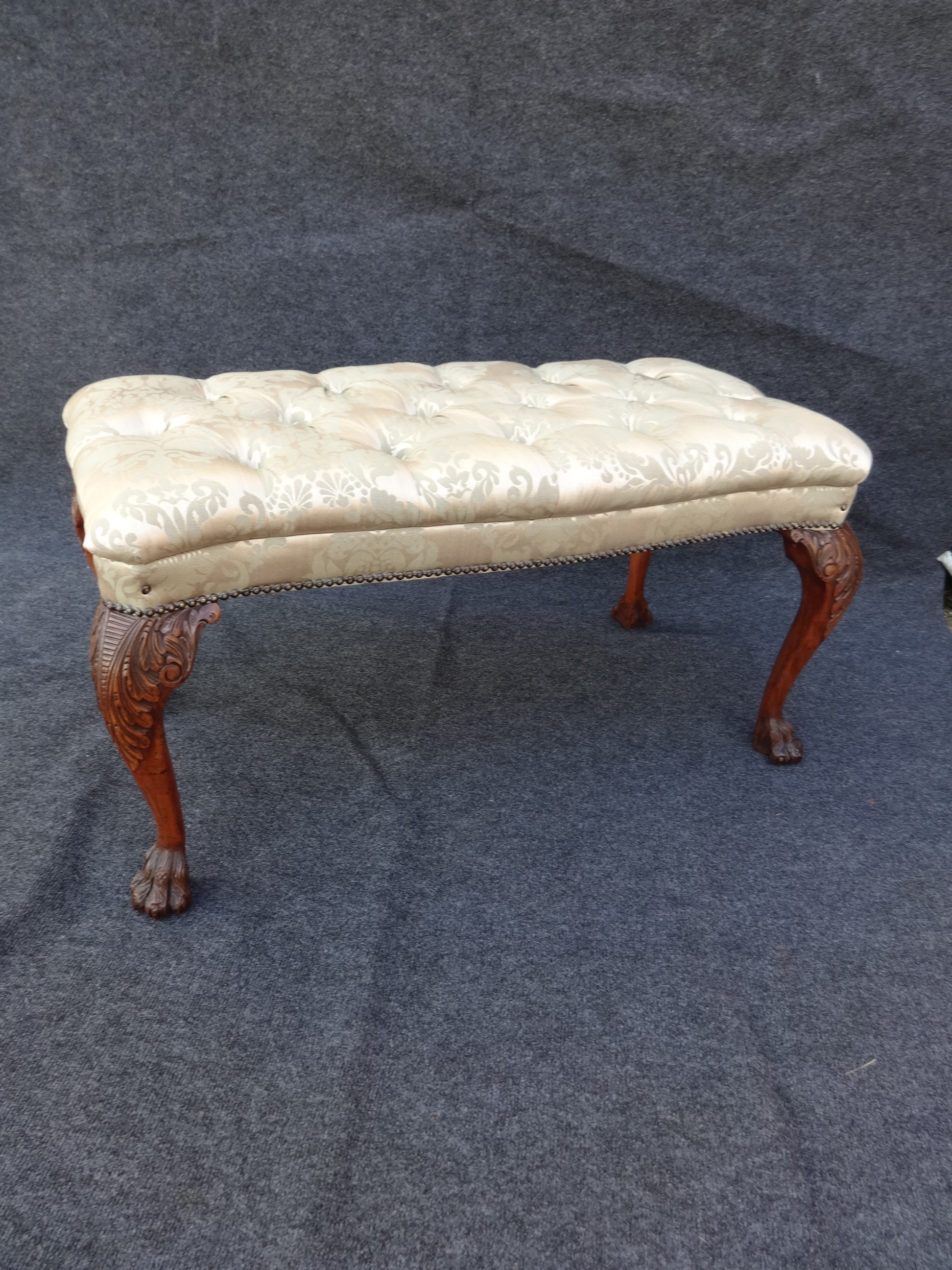 Offered for sale is this fantastic serpentine duet stool that has been re-covered in a pale green damask. It has a serpentine frame and stands on hairy paw feet with very crisp carvings.