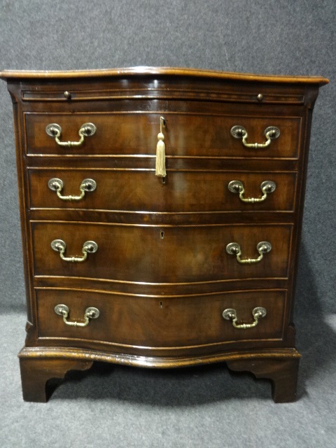 This is a good mahogany serpentine chest of drawers with brass handles, blushing slide, standing on bracket feet and in very good original condition.