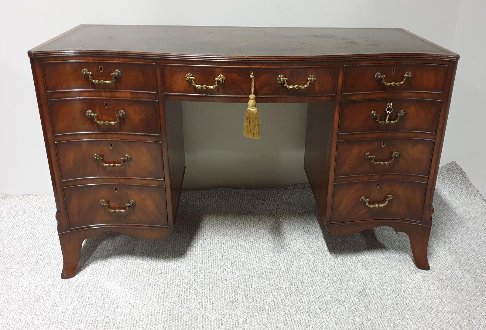 A very nice mahogany serpentine desk, six drawers and a singe cupboard, working locks with keys, brass handles, original brown leather, standing on outswept legs, in overall excellent colour and condition.