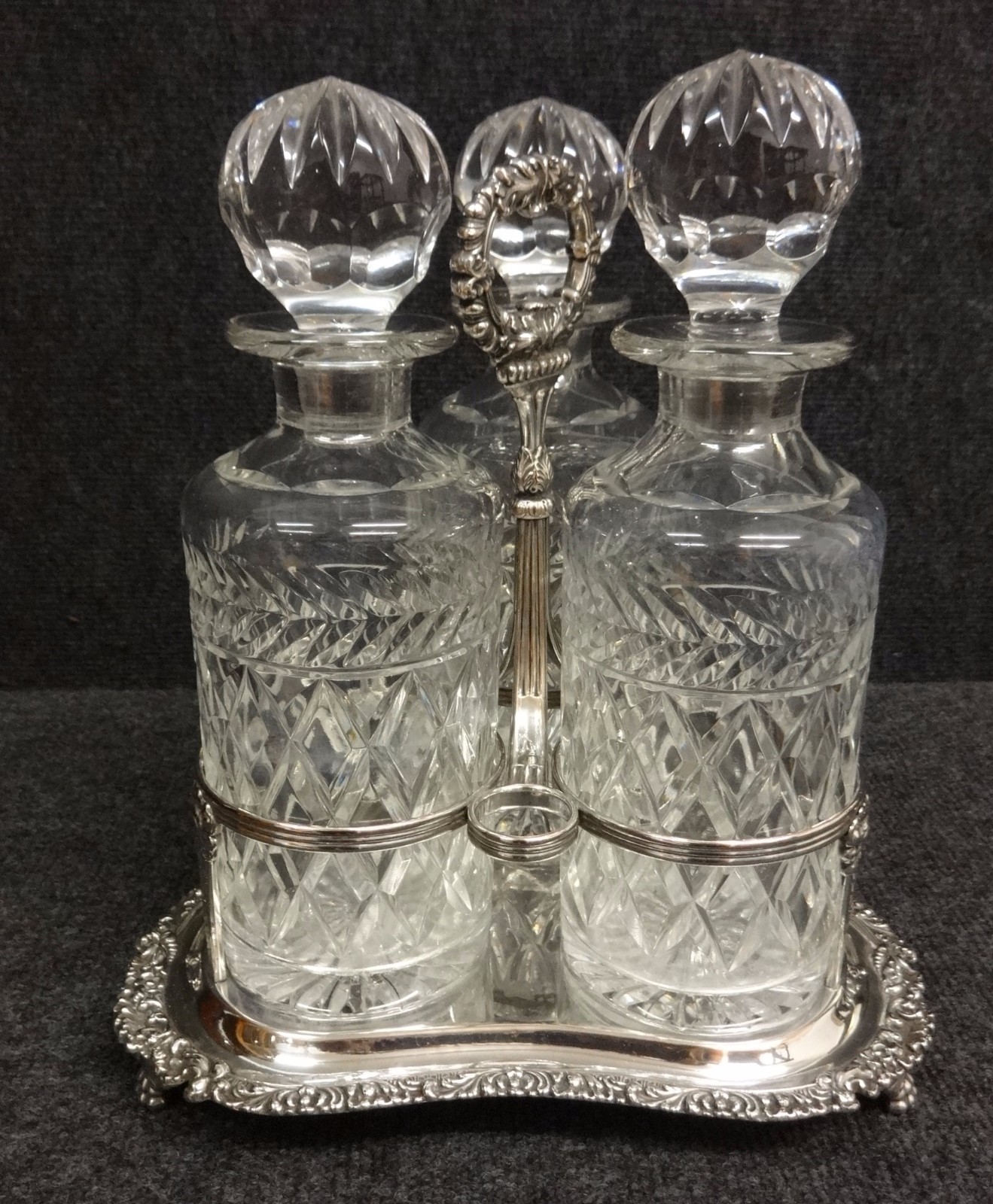 This is a good antique three bottle tantalus, 3 cut glass bottles in silver plated stand, all bottles in perfect condition.