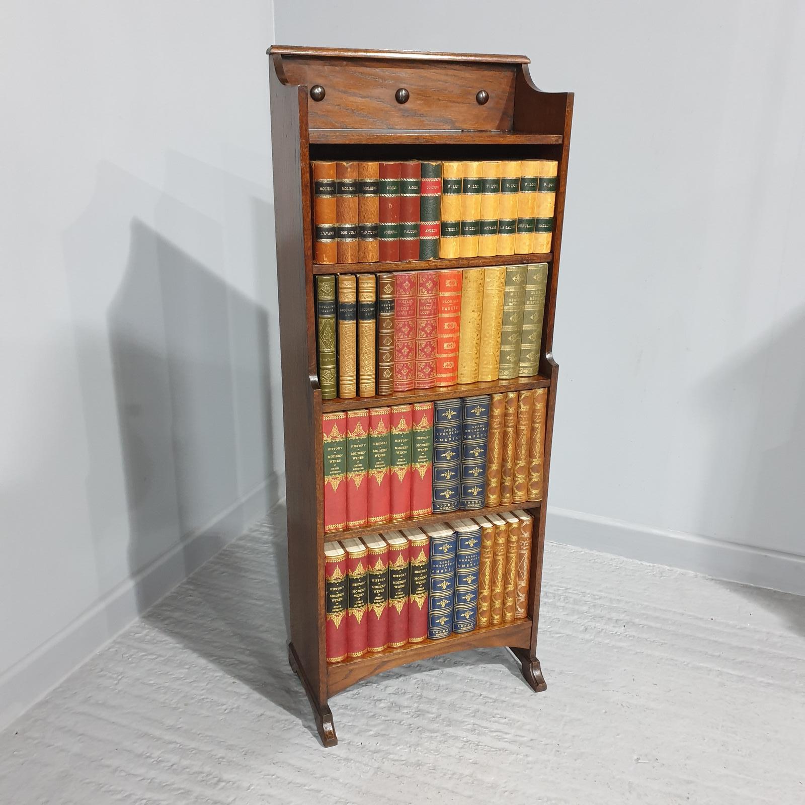 This is a very nice slim early 20th Century antique oak waterfall open bookcase, in excellent condition with medalions to the top.