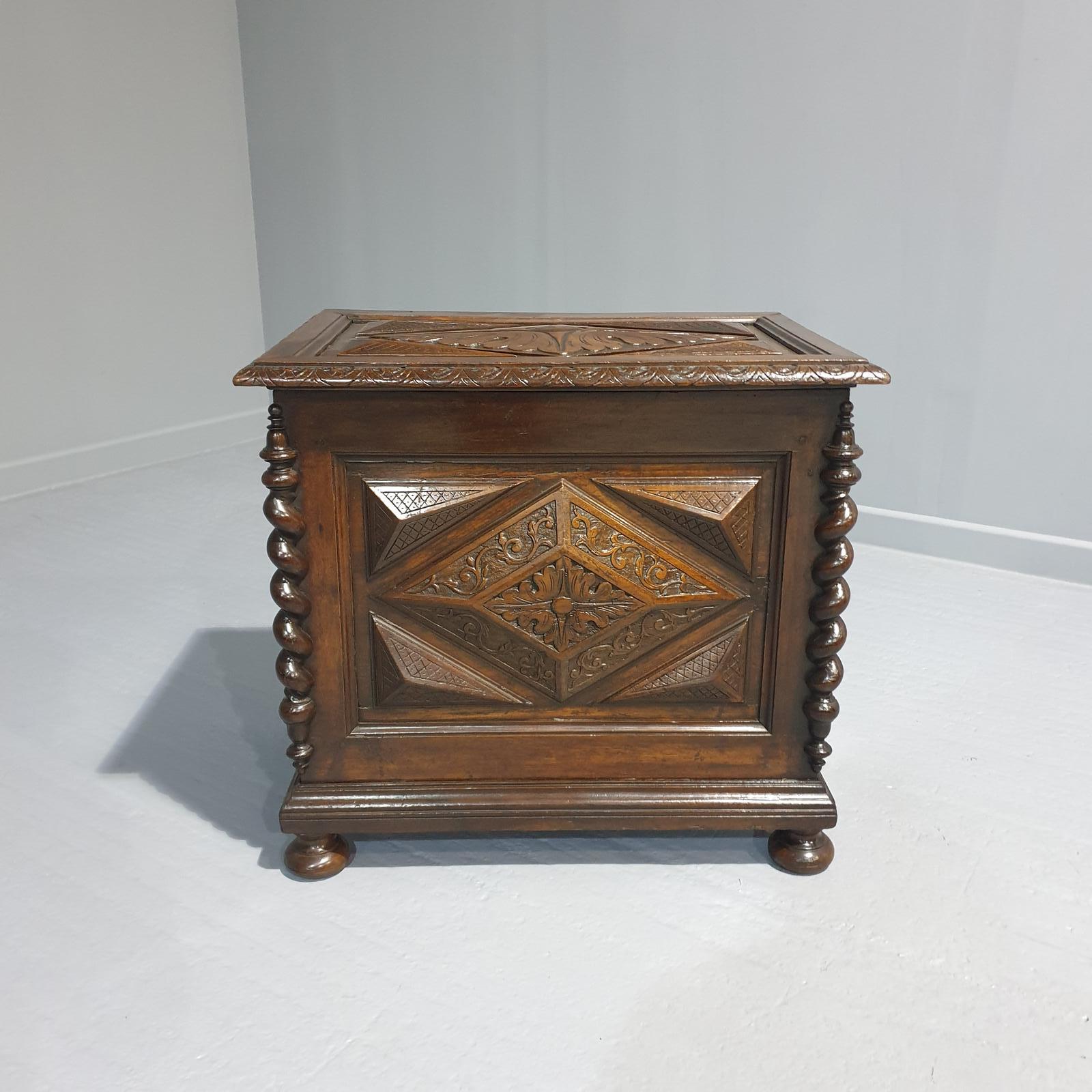 This is a very good French oak coffer or log box, with raised carvings, twisted corners, standing on ball feet, historic worm holes, excellent colour and condition..