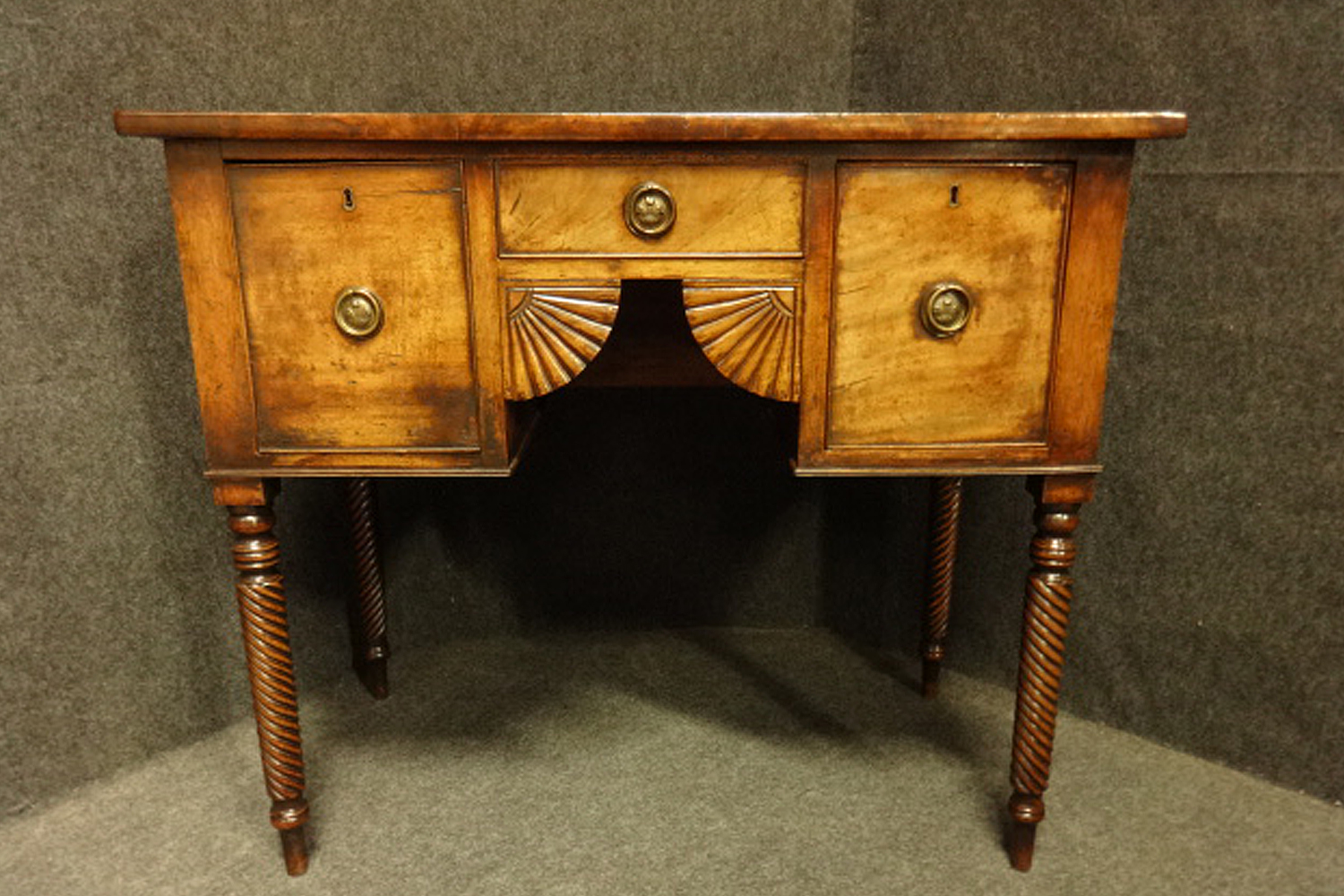 This is a good 19th Century Regency antique mahogany sideboard of small proportions, two large drawers and one small central drawer, standing on twisted legs, signs of old worm in drawer linings, which has been treated, in very good overall condition.