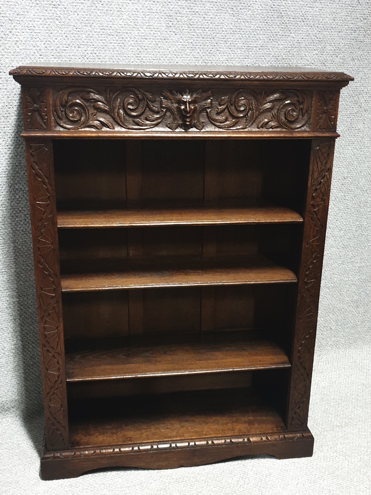 Excellent quality green man solid oak open adjustable bookcase, with reeded panel sides. Excellent colour and condition.