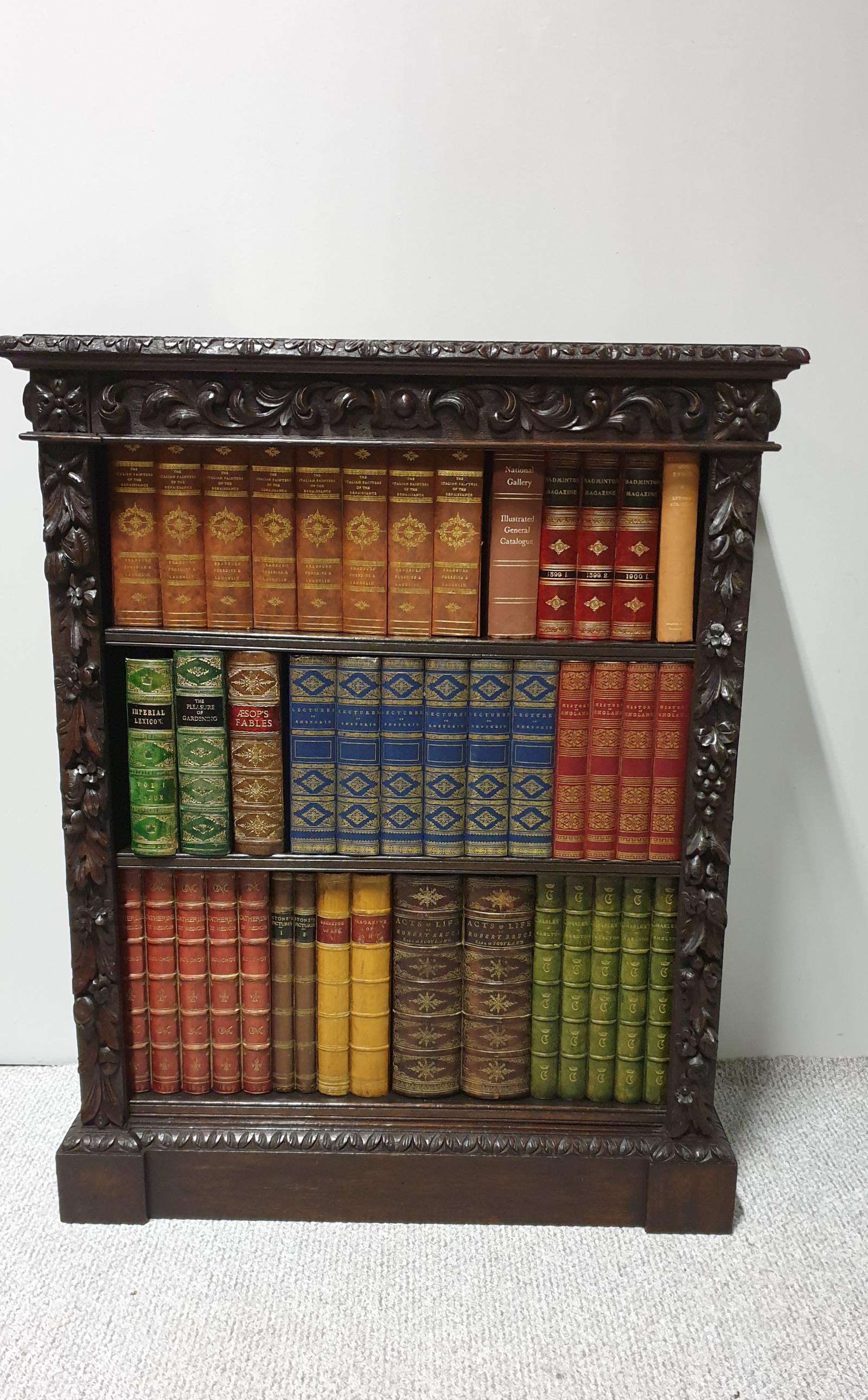 Excellent quality solid oak open bookcase depicting fruit and deep carved scrollling, three adjustable shelves, in excellent original condition.