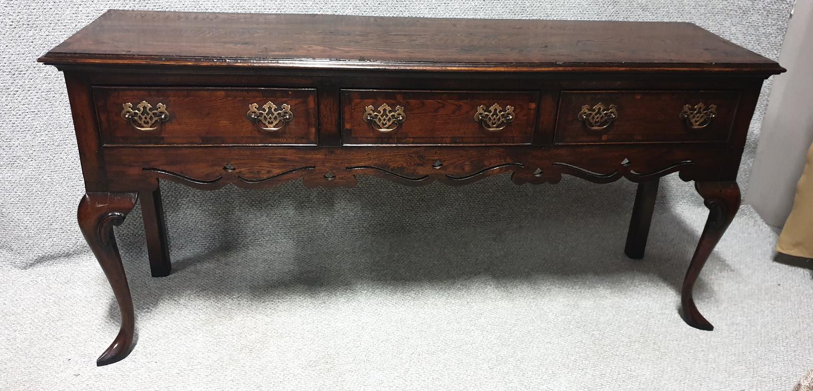 A superior solid oak three drawer dresser base, crossbanded with yew wood, brass plate handles, peg jointed throughout, excellent colour and condition.