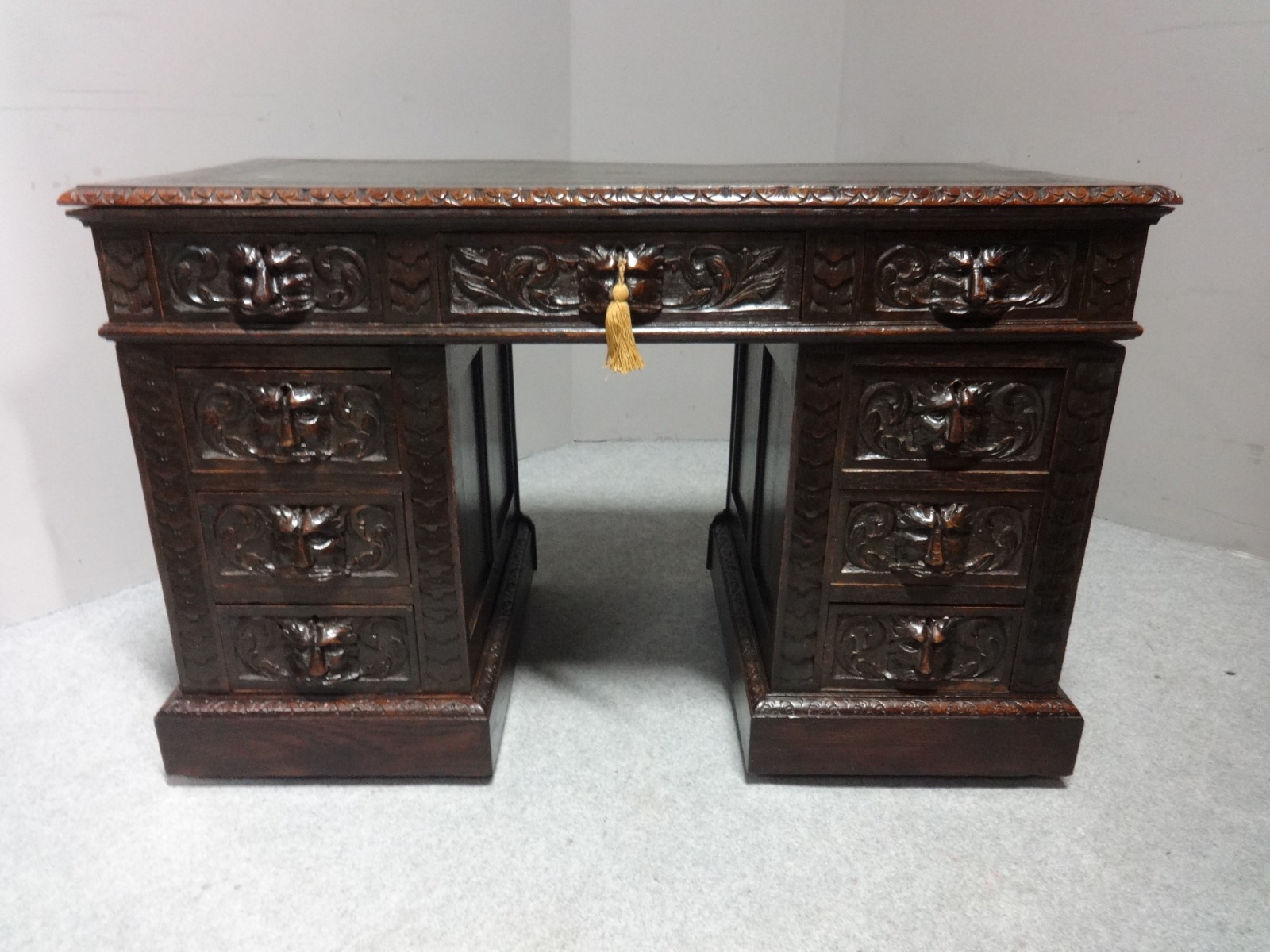 Solid Oak Green Man Carved Oak Pedestal Desk c.1880