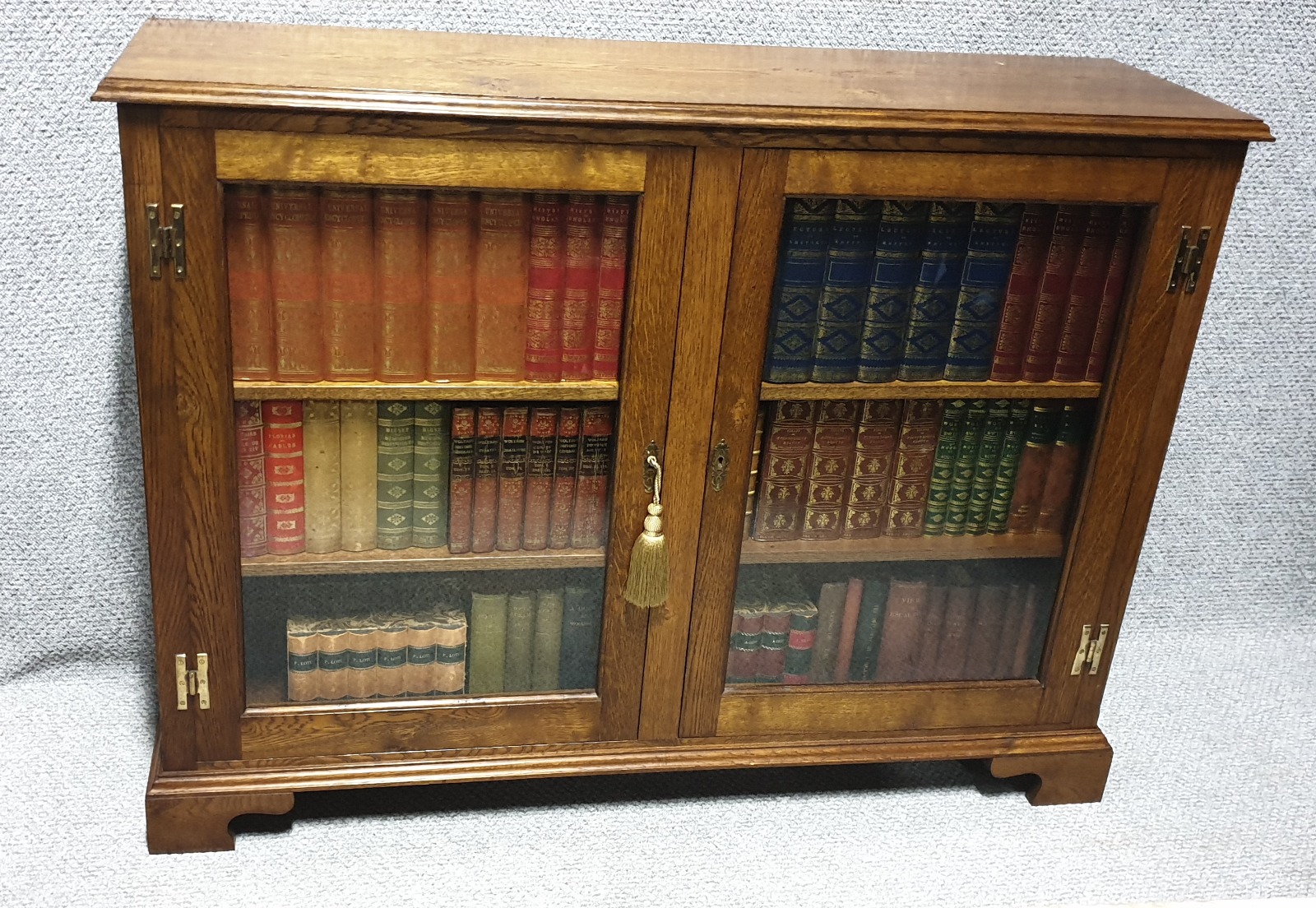 A very good quality solid oak adjustable bookcase, three oak shelves, brass hinges and key covers, excellent colour and condition.