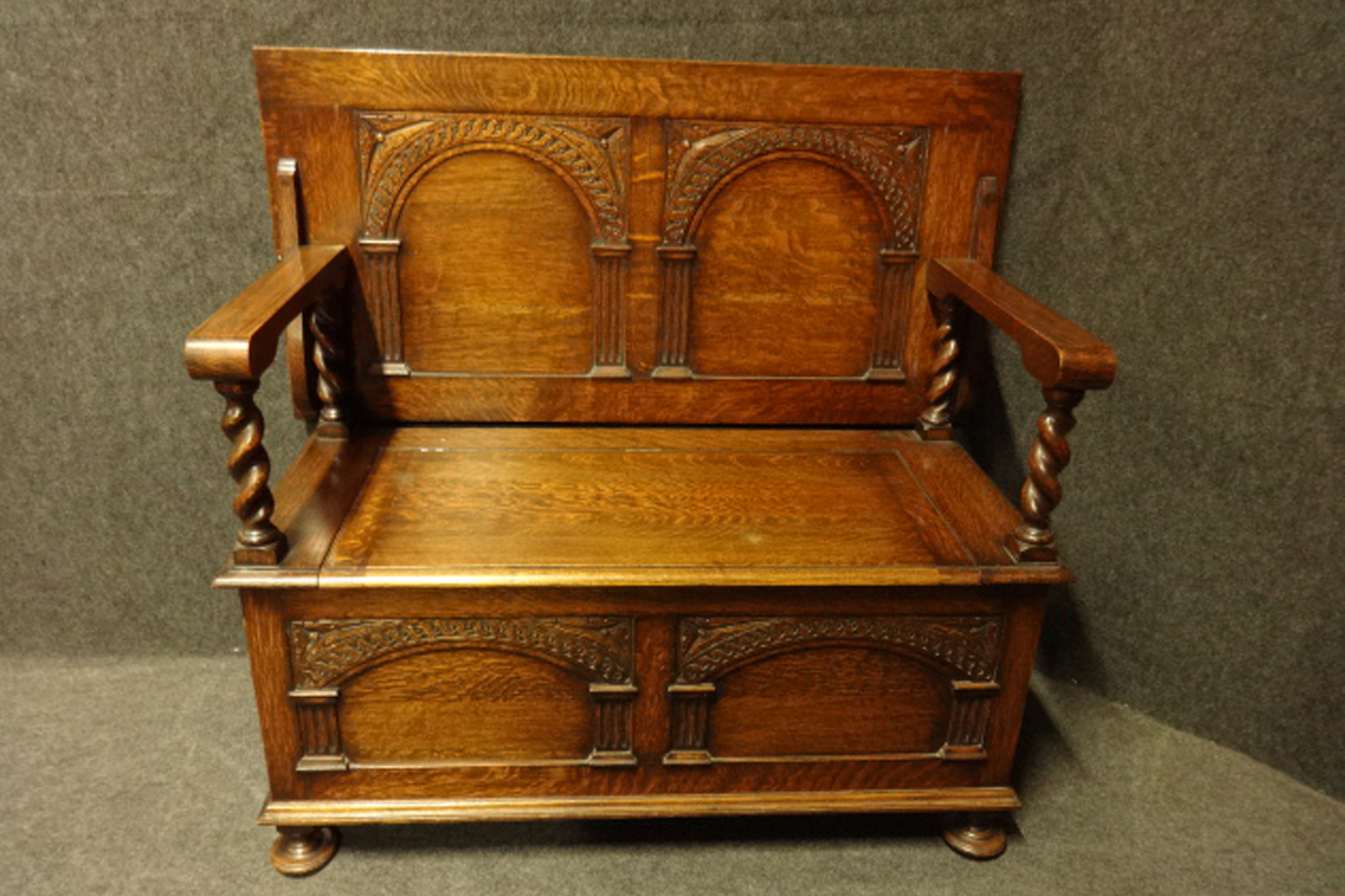A very good quality solid oak monks bench, which converts to a table, carved oak panels with lift up box lid, barley twist supports and a panelled back, makers badge, in excellent original condition with a very good medium oak colour.