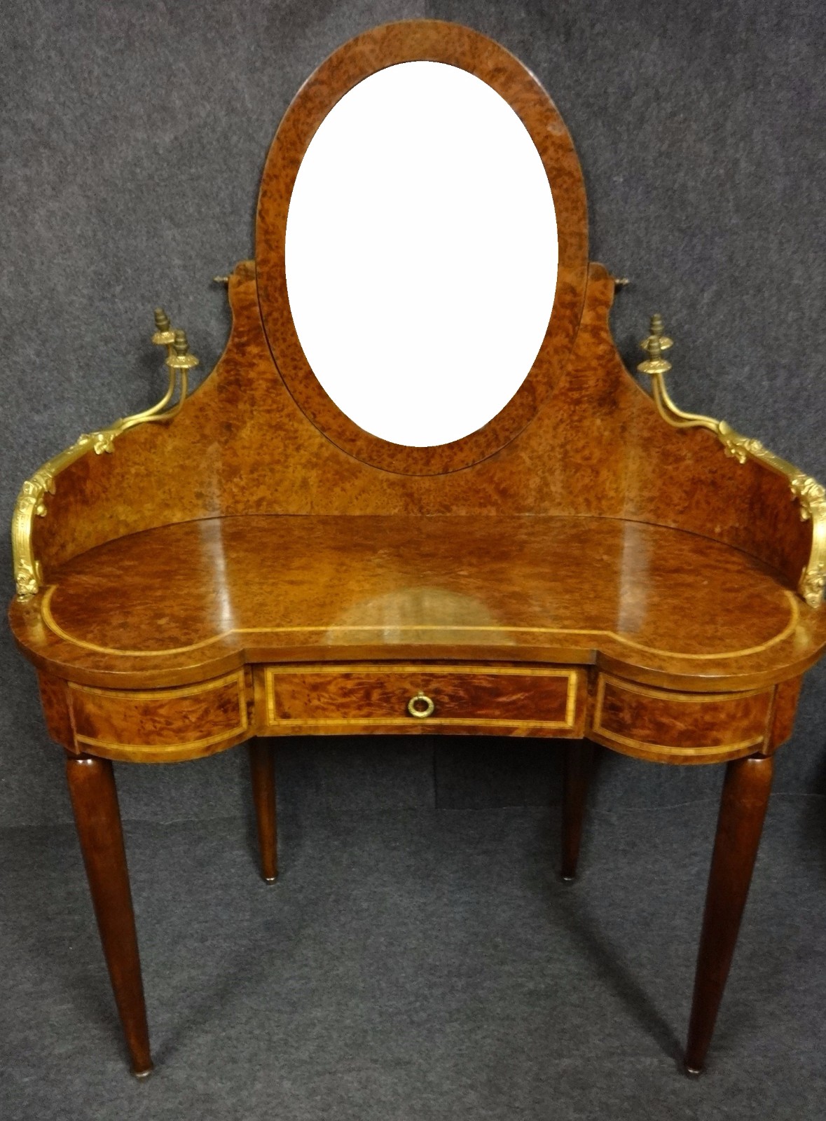 Curved dressing table with satinwood inlay, single drawer, with attached stunning bronze and gilt lights, adjustable bevelled edged mirror, standing on turned legs with brass ball feet, excellent colour and condition.