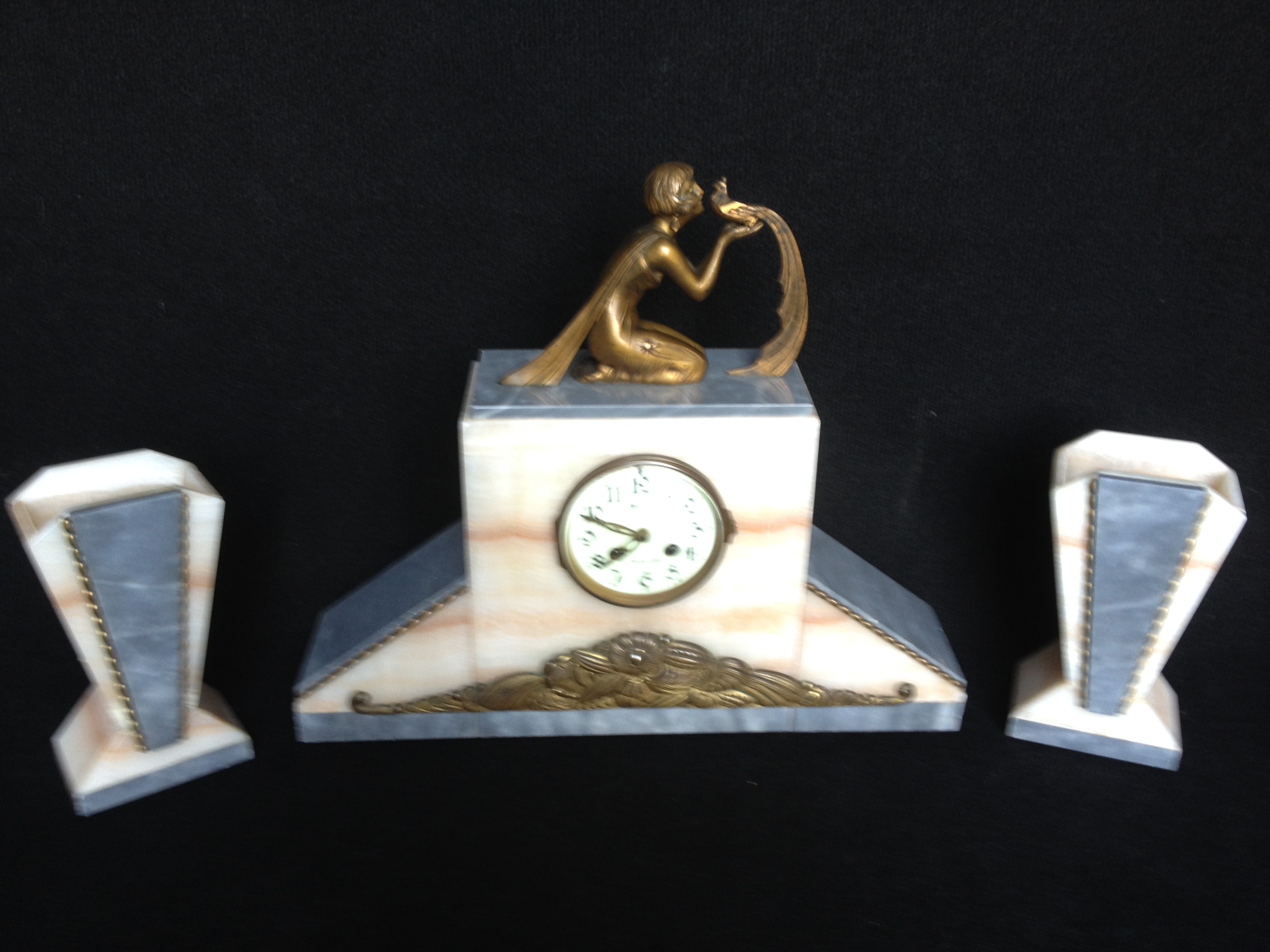 Stunning Art Deco Marble Clock Garniture with a lovely bronzed figure of a girl holding a bird, ormolu embellishments, blue/grey marble with pink and white. Fully serviced and cleaned.
