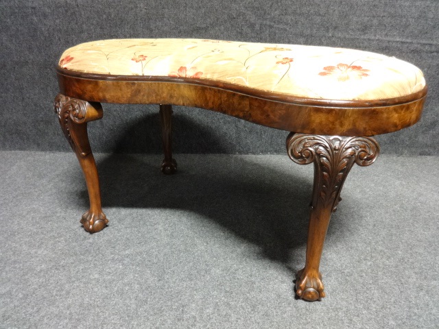 This is a very good quality burr walnut duet stool in a kidney shape, standing on very crisp carved ball and claw legs, excellent colour and condition.