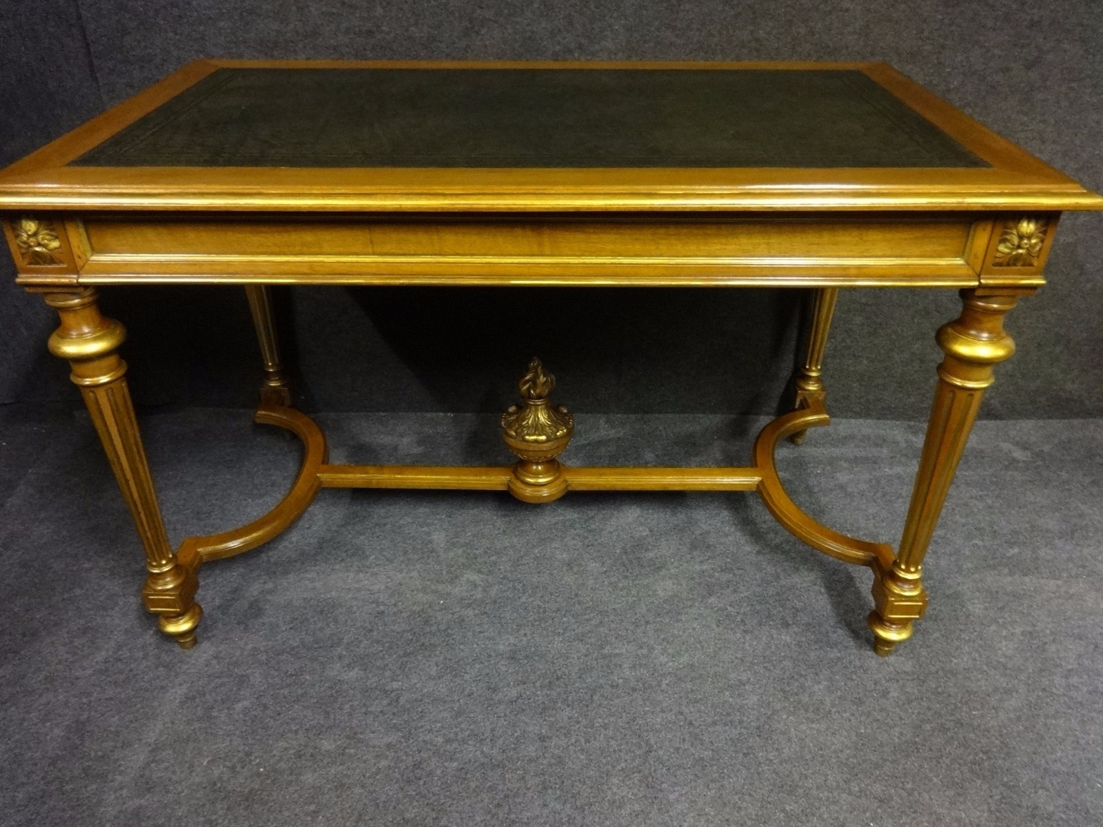 This is a stunning 19th Century French antique walnut desk, with single full width drawer, green replacement leather, parcel gilt highlights, and a lovely carved urn with flames, carved stretcher, turned legs, in excellent original condition.