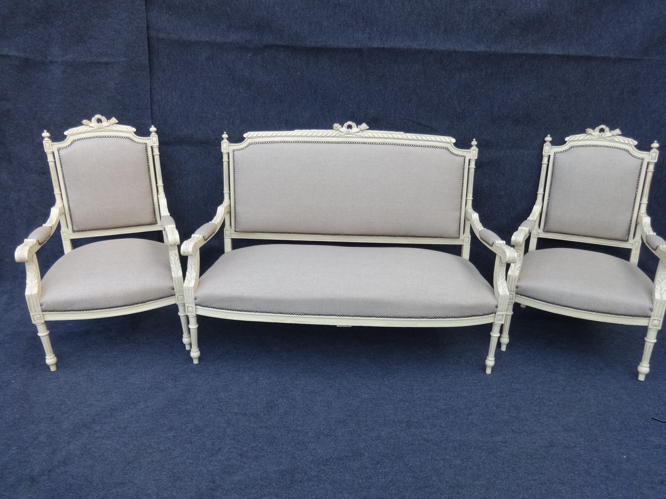 Offered for sale is this stunning French painted suite from the 19th Century. It is a good sized couch alongside 2 arm chairs that are painted cream and have been newly upholstered in light brown linen style fabric.