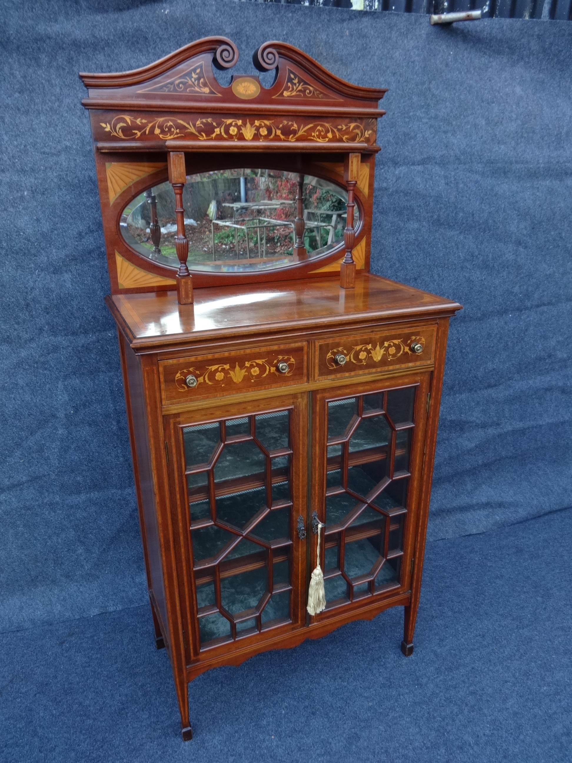 Offered for sale is this stunning inlaid mahogany display cabinet which is excellent in colour and is a lovely size with good inlays. This antique cabinet is very pretty and has 2 drawers and 2 doors.