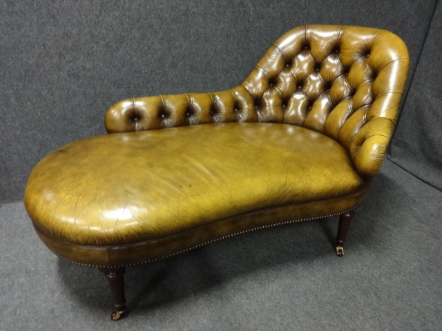 This is a stunning olive green leather chaise lounge of small proportions, fabulous colour and in excellent condition, standing on brown pot castors.