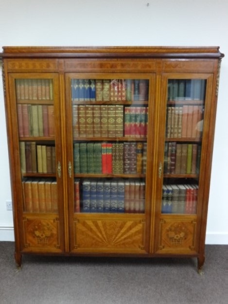 An absolute stunning and excellent quality 3 door library bookcase, veneered in tulipwod, kingwood, rosewood, mahogany and other exotic woods. it has superb marquetry panels, quality ormolu mounts and 4 adjustable shelves with tulipwood fronts. All in excellent original condition. Should be viewed to appreciate the beauty and quality of this piece.
