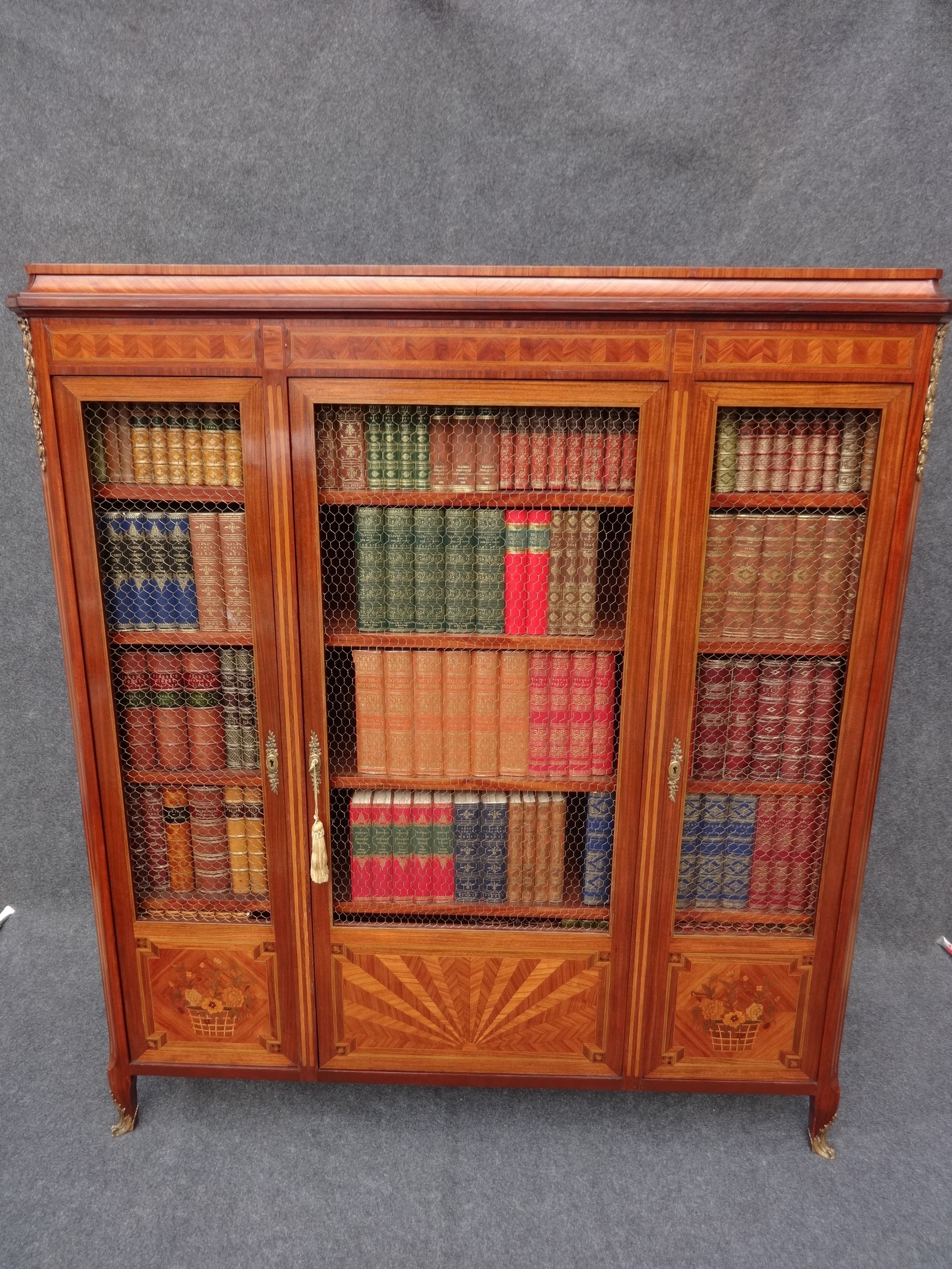 An absolute stunning and excellent quality 19th Century antique 3 door library bookcase, veneered in tulipwod, kingwood, rosewood, mahogany and other exotic woods. It has superb marquetry panels, quality ormlou mounts, 4 adjustable shelves with tulipwood fronts, gilt wired doors. Should be viewed to appreciate the beauty and quality of this piece.