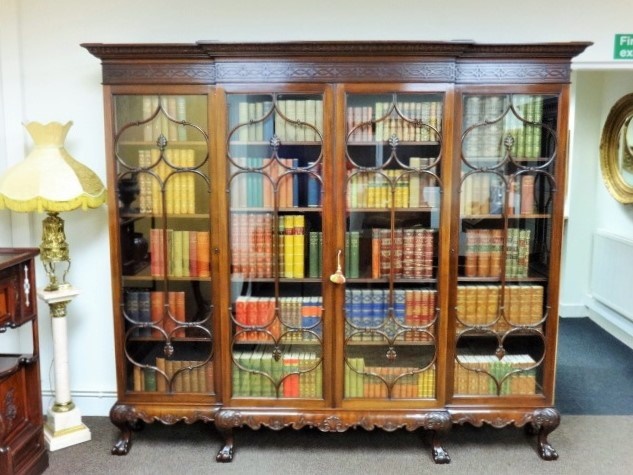 A stunning and wonderful colour library bookcase, of breakfront construction, comes into 9 pieces for easy of delivery, each section has 4 polished adjustable shelves (3 sections), piano hinges doors, superb glazing bars, very crisp carvings, standing on ball and claw feet, in excellent condition.