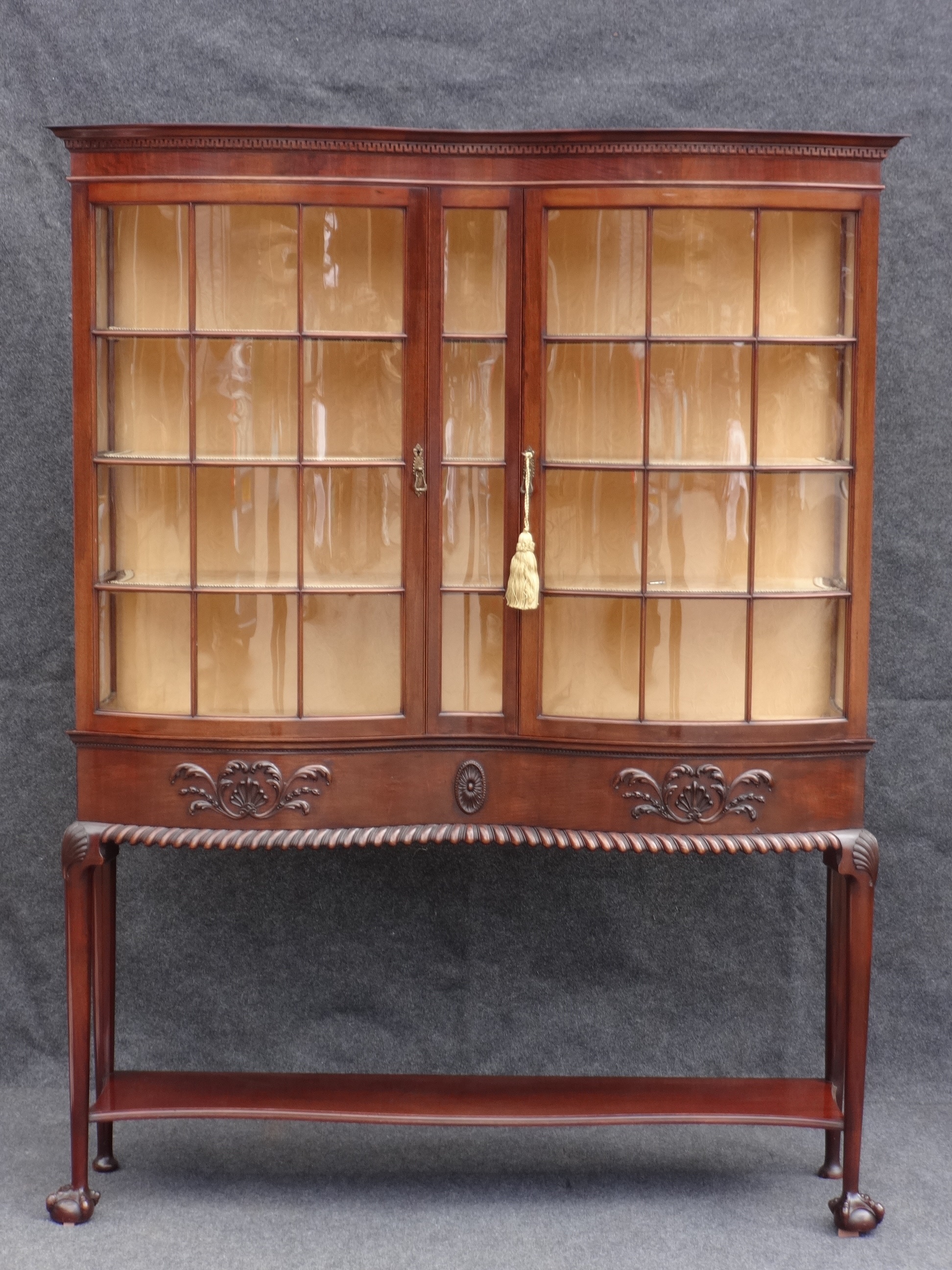 This is an excellent quality antique serpentine display cabinet which has a concave side glass and convex front glass. This is a top quality cabinet standing on ball and claw legs It is relined in gold. Keys available.