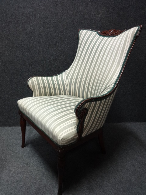 This is a beautiful and elegant antique mahogany framed wing armchair, with rope and tassel edging and elegant carved legs.