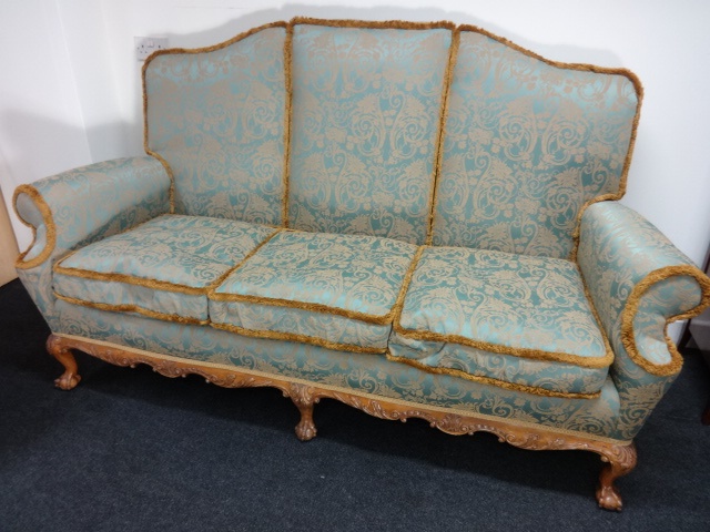 This is a very elegant sofa with the original green and gold damask covering and feather filled cushions. This sofa is in perfect condition, is very comfortable and has an excellent shape. It has a carved frieze and it stands on 3 ball and claw legs to the front.