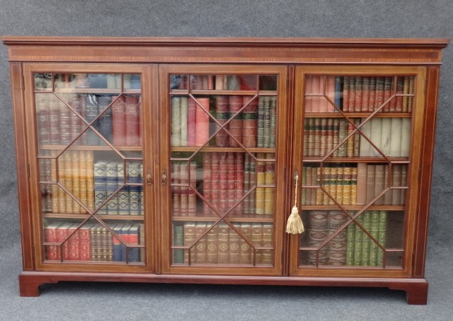 An excellent quality antique mahogany bookcase inlaid with satinwood banding and boxwood lines, 2 opening doors with 3 adjustable shelves and single door to the end with another 3 small adjustable shelves, all polished with boxwood lines.