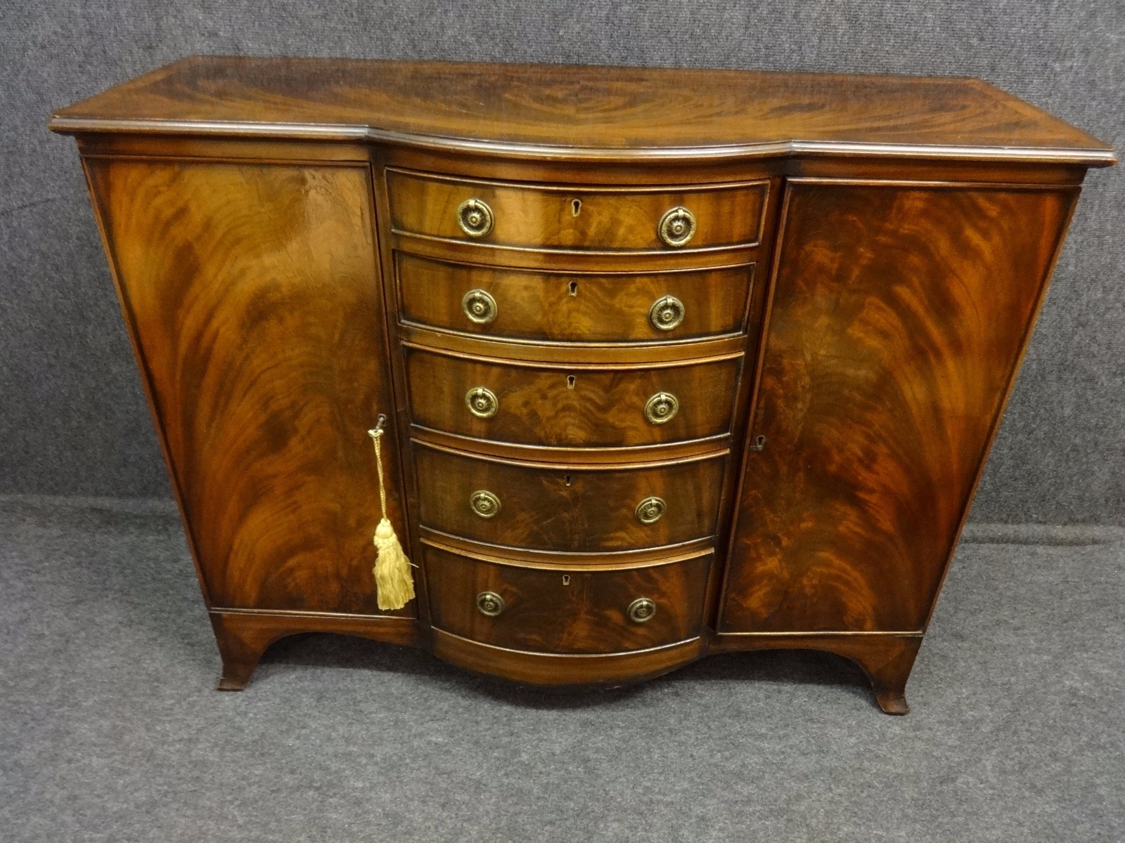 This is a stunning antique miniature mahogany sideboard that has a central section with 5 bowed drawers with brass handles, flanked by doors behind which are adjustable shelves. It is oak lined and stands on outswept legs.