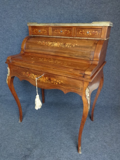 This is a stunning French antique rosewood cylinder desk which has drawers that open to lift cylinder and reveal drawers and pigeion hole. The desk folds over to reveal baize, ormlou mounts to knees an toes and brass gallery. It is all inlaid with marquetry flowers and has an excellent colour.