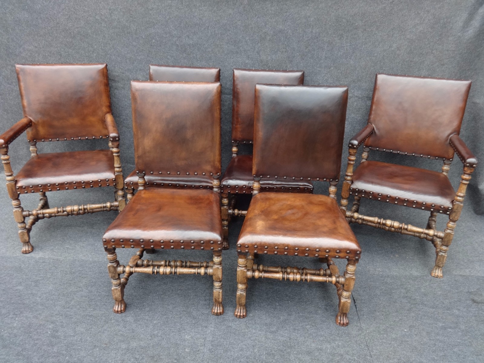 With fantastic lower stretchers and legs, paw feet, peg jointed throughout, hide covered with steel studs, including 2 carvers, in excellent condition, excellent colour.