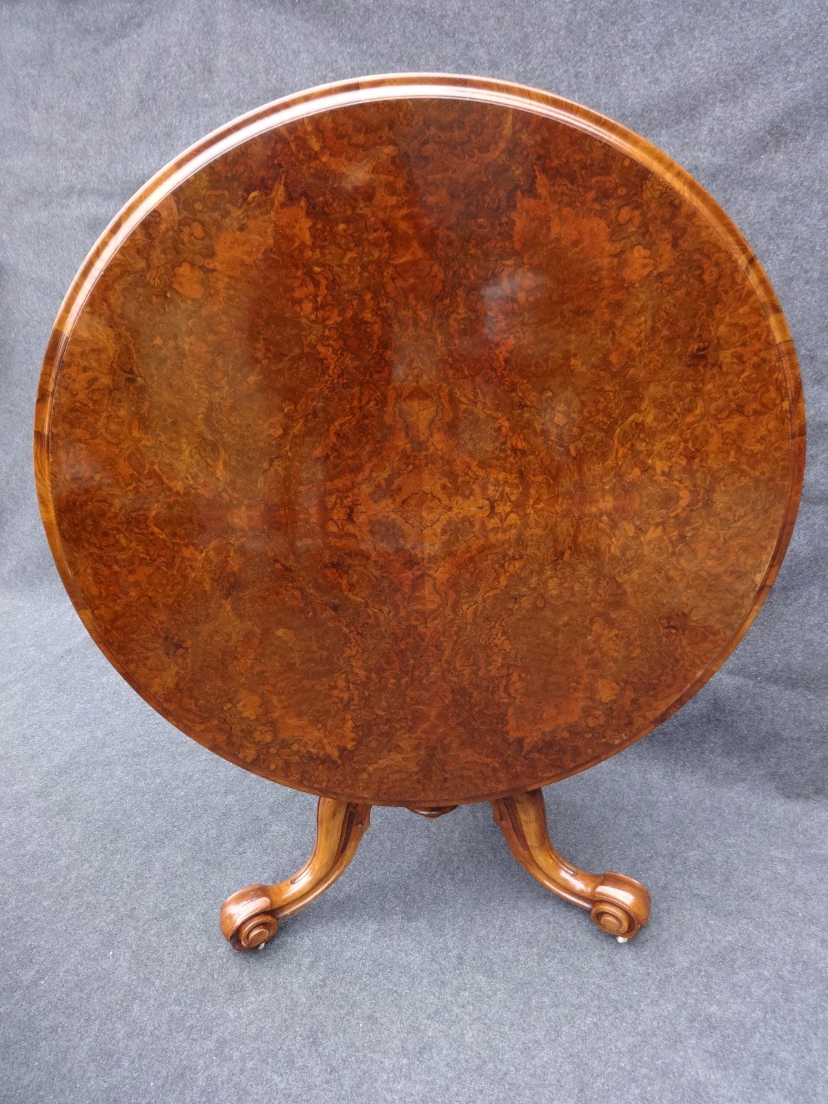 This is an excellent quality 19th Century antique burr walnut center table. It has a repolished top. Ideally used as a breakfast table or dining table.