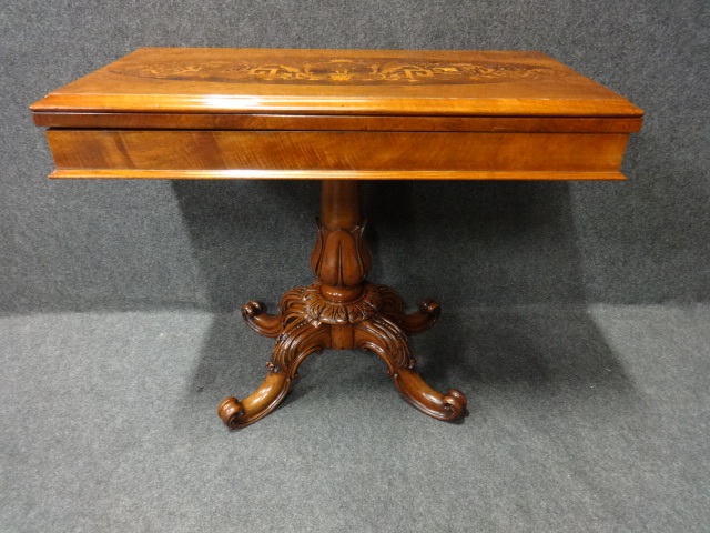 This is a stunning 19th Century antique walnut card table with acanthus leaf base on scroll legs, the top is profusely inlaid with mythical animals and figure, opens to reveal replaced baize.