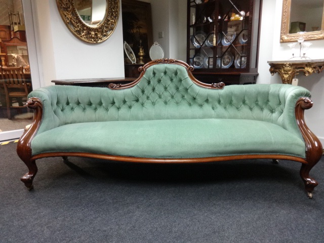 This is a stunning 19th Century Victorian antique walnut settee which stands on brass castors, deep buttoned pale green upholstery, in excellent condition, and an excellent colour.