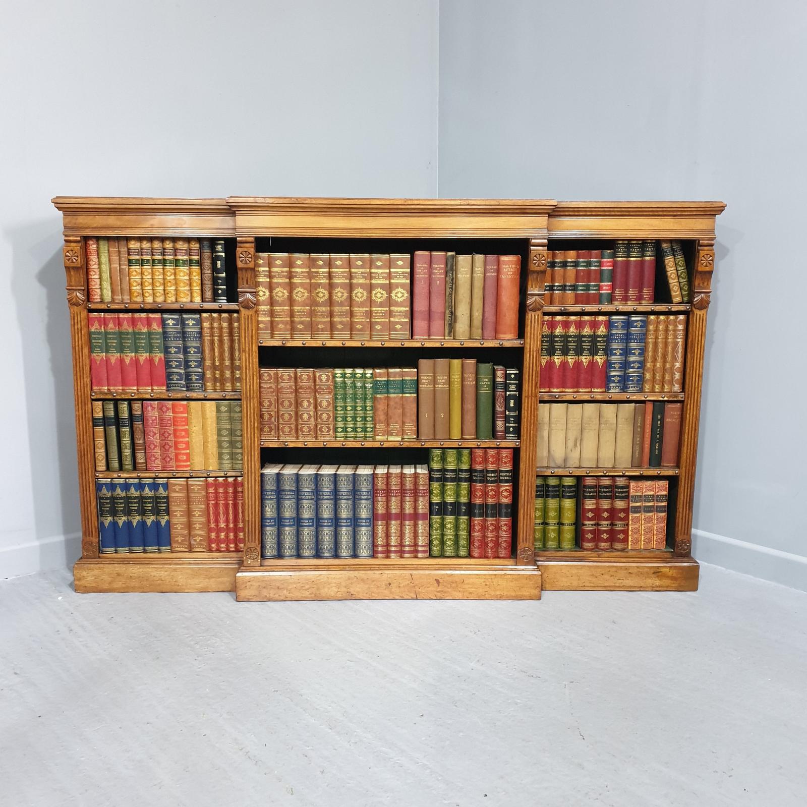 This is a very nice late 19th Century Victorian antique walnut open adjustable breakfront library bookcase, in very good overall condition.