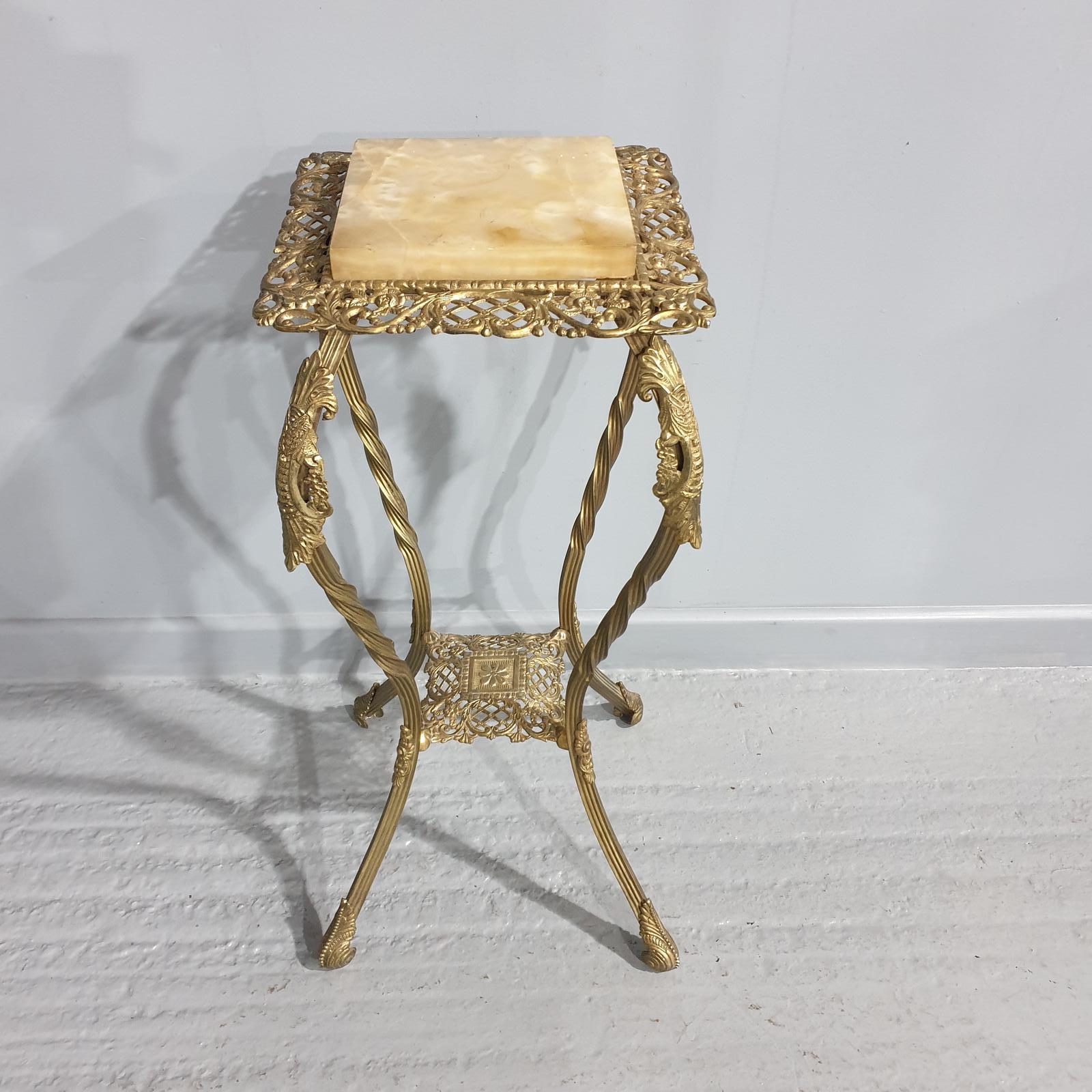 This is a lovely brass plant stand with twisted legs, filagree under shelf and top shelf with marble inset, lovely original condition.