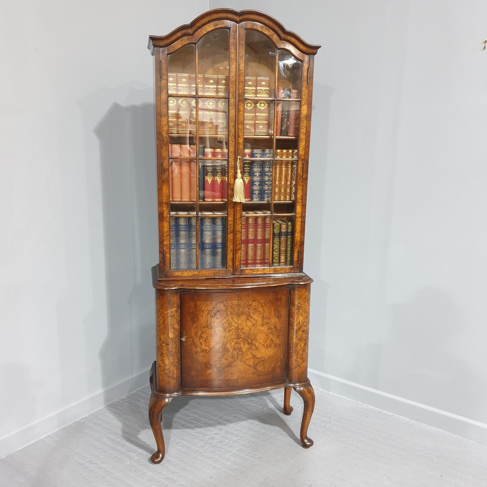 This is a very nice arched top burr walnut bookcase with three adjustable shelves, and single door cupboard below with shelf, standing on cabriole legs, in overall very good condition, splits into two.