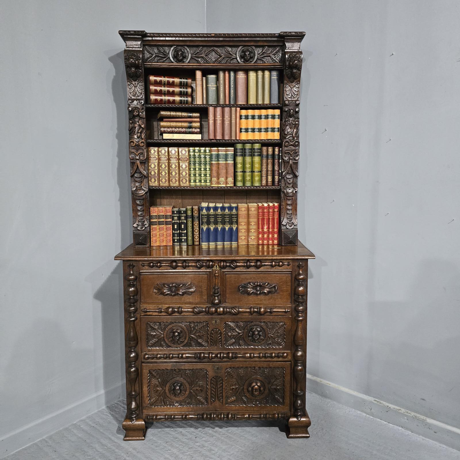 A very nice coloured oak carved open bookcase to the top two drawer base and lift up cupboard, solid oak throughout with mythical faces and geometrical lines, in very good overall condition.