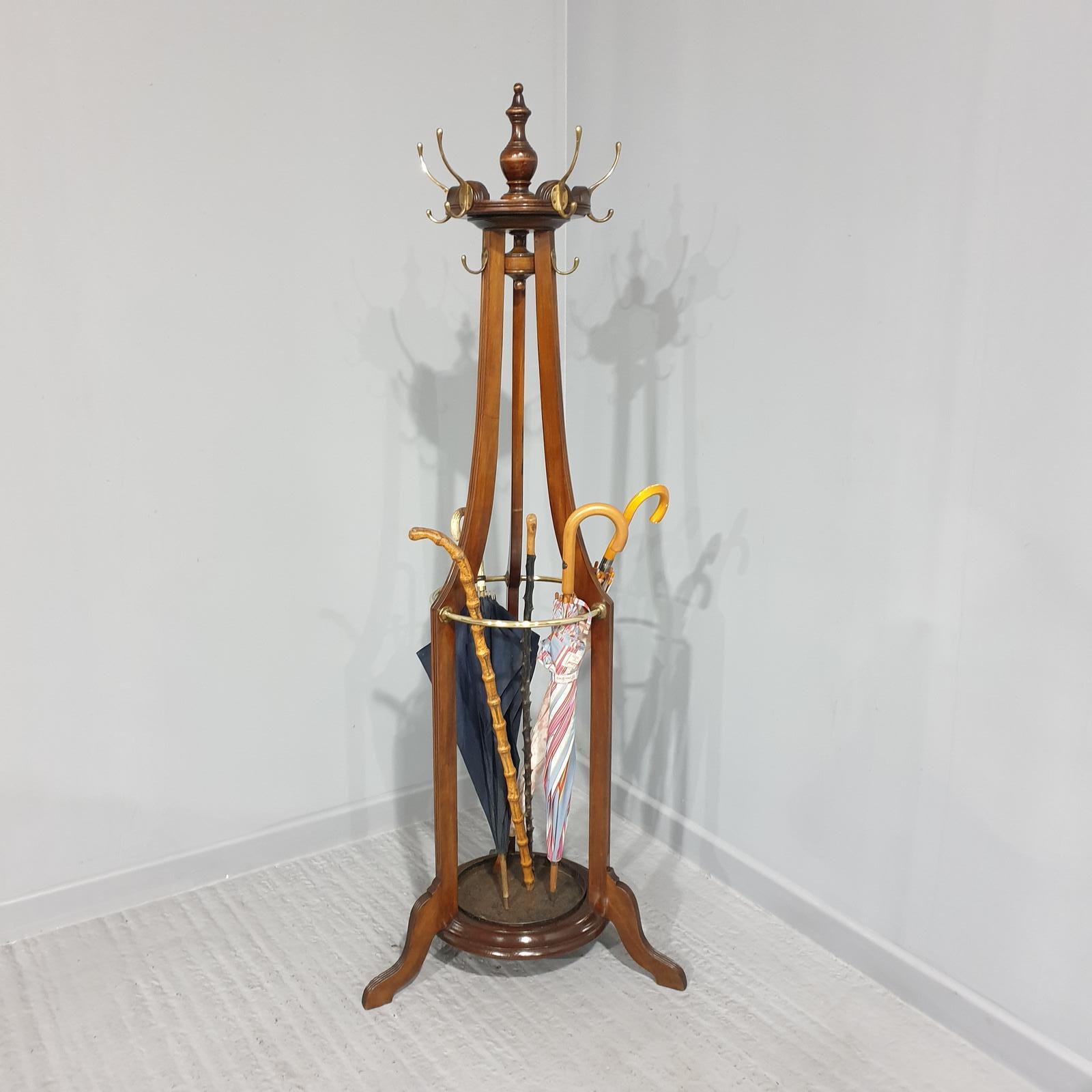 This is a very good late 19th Century Victorian antique mahogany coat and stick stand with brass swivel coat hooks and brass rail, in very good overall condition.