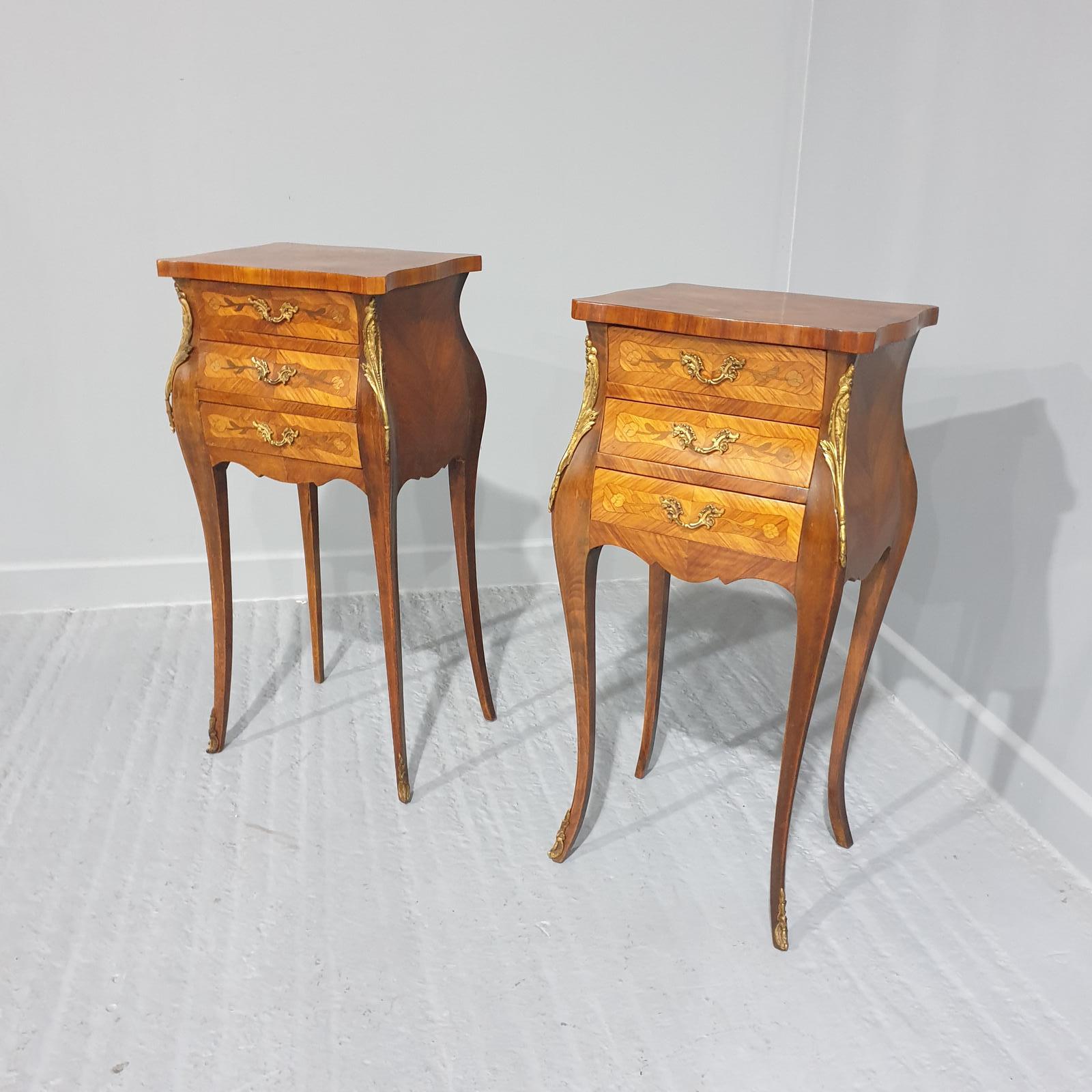 Excellent quality French bombe shaped marquetry three drawer bedside lamptables, brass feet and handles and mounts, excellent colour and condition.