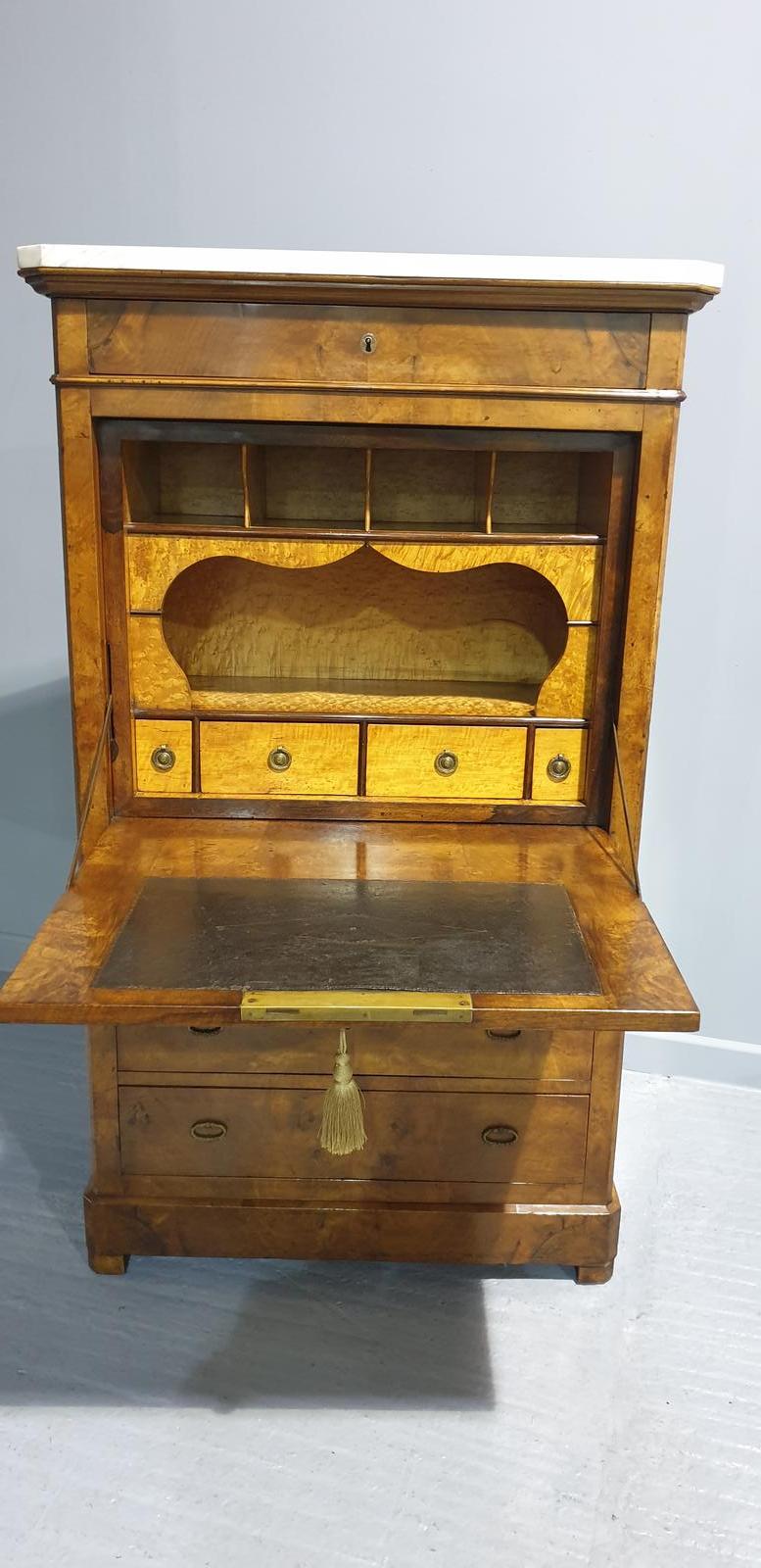 This is a very nice 19th Century French antique burr walnut Escritoire bureau/desk, with white marble top, oak lined throughout, single drawer to the top and three drawers under desk flap, superb double lock with original key, in excellent original condition.